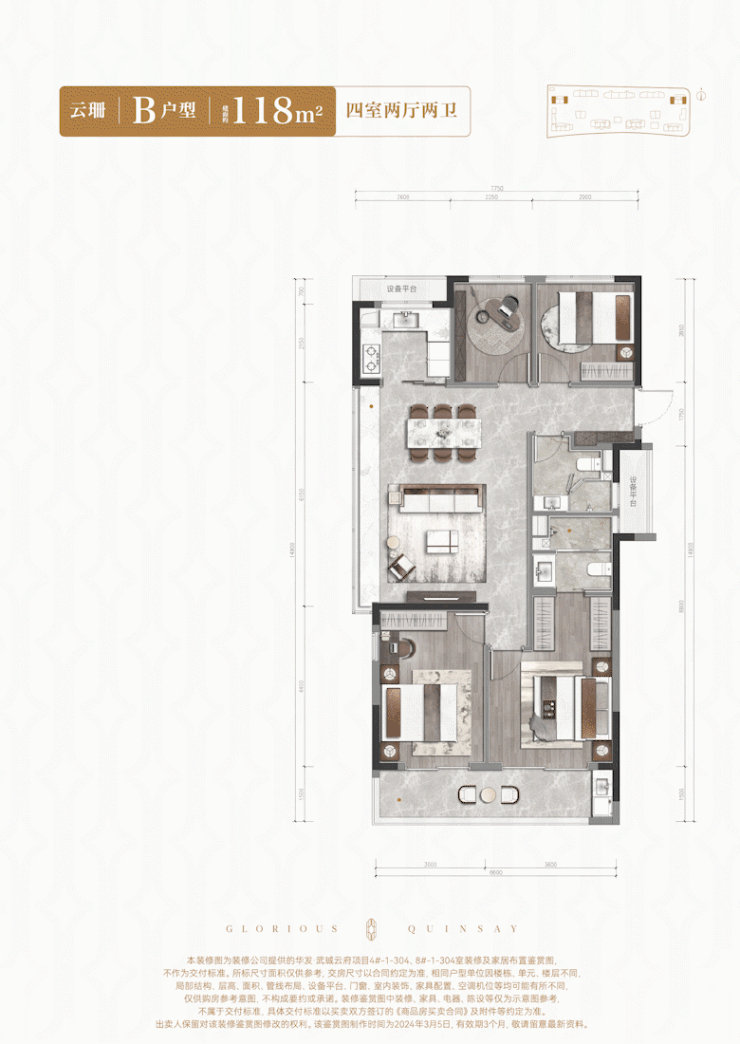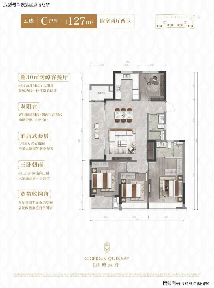 127方 四室两厅两卫:最令人惊喜的是整体空间超 30⽅的客餐厅,宴客会友从容不拘。边套的位置大幅提升室内采光的通透性;双阳台的设计更便于功能分区,满足日常观景和生活晾晒双重需求。