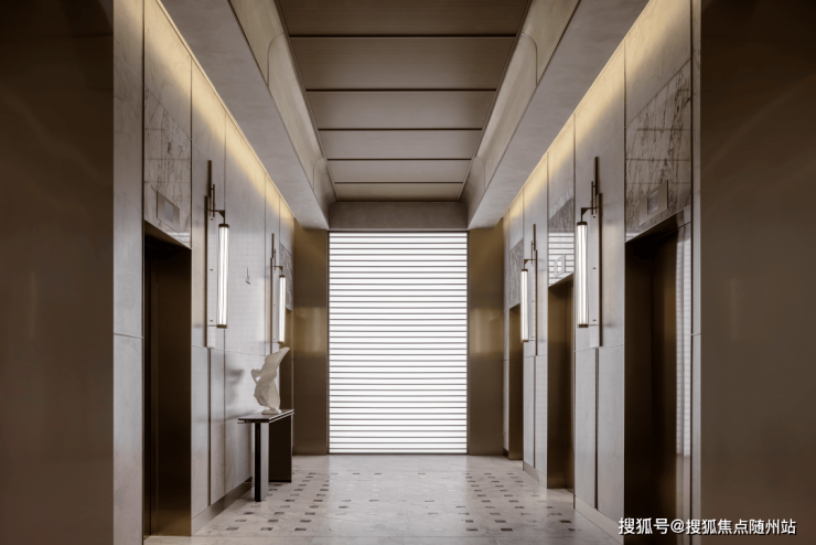 电梯厅,奢感随处可见。地面嵌入玻利维亚蓝奢石、电梯门运用比肩五星级酒店的哑光铜表面拉丝工艺,彰显雅奢特性;电梯内部则以技艺更为复杂的木饰面弧形转角、黄金比例分割的金属哑光拉丝腰线,呼应高级定制的品位。