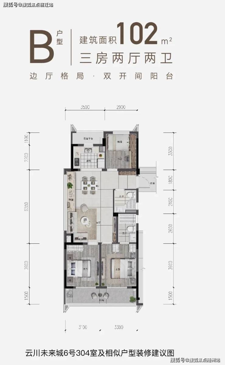 建面约102㎡的三房两厅户型,引入采光与视野条件优秀的边厅设计,餐客厅景观面达到约6.55米。两间主要的起居卧室全部朝南,还设计了双联阳台,满足洗衣晾晒需求之余还能摆上一座茶几,午后躺着小憩或是看书都很适合。