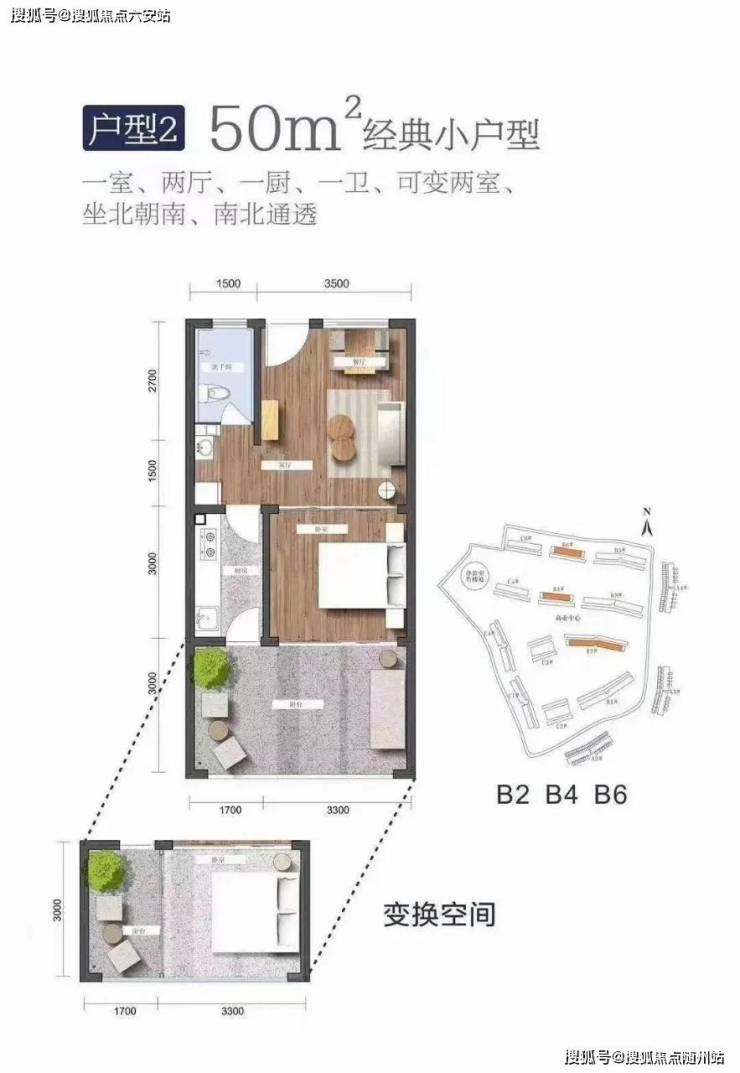 建筑面积51㎡,一室一厅一卫,可变换两室,坐北朝南,南北通透,硬装交付