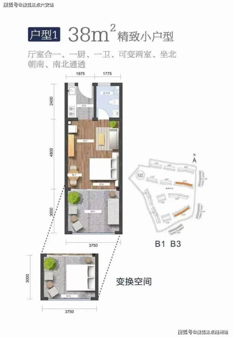 建筑面积38㎡,一室一卫,可变换两室,坐北朝南,南北通透,硬装交付