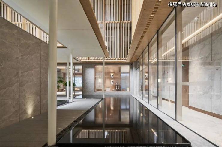 办公、公寓中庭空间,是大堂进入之后的必经之路,需具备一定的迎宾仪式感。整体均由水景、雕塑、曲折路线构成,现代空间场景中又有一定的科技感,具有多角度的观赏效果及体验。