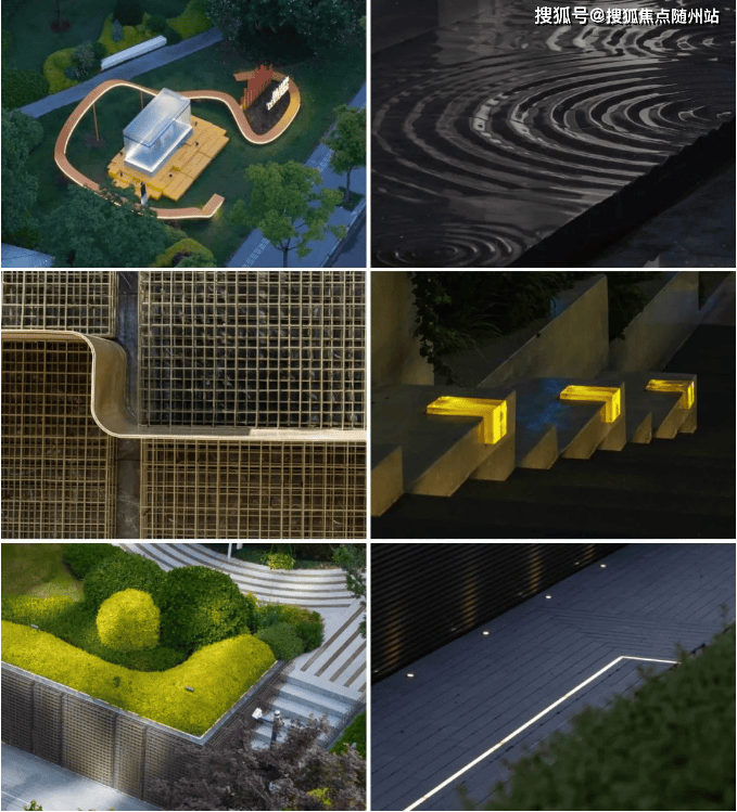 屋面路径贯穿所有功能模块,受整体绿地率、建筑结构等因素影响,道路被墙体及玻璃幕墙包裹。为保证人行视角的丰富性及舒适性,景观在设计中将墙体及地面赋予了不同的肌理。