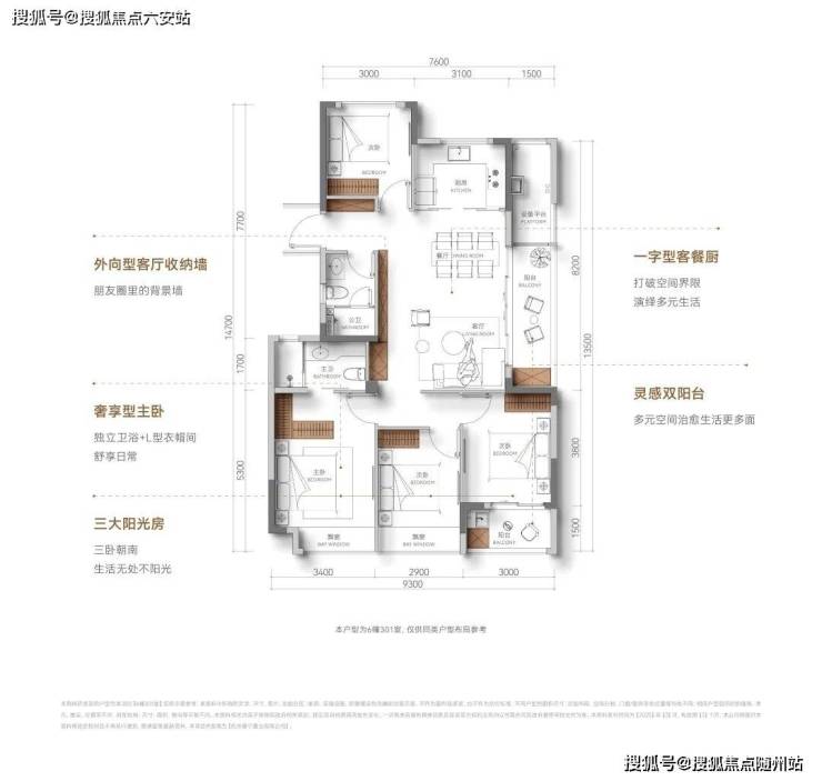 三房朝南,面宽约9.3米,户型设计双阳台双飘窗,能完美地将生活与休闲功能分隔开;主卧套房设计,尺度宽绰,带步入式衣帽间,处处彰显改善盘的空间感。