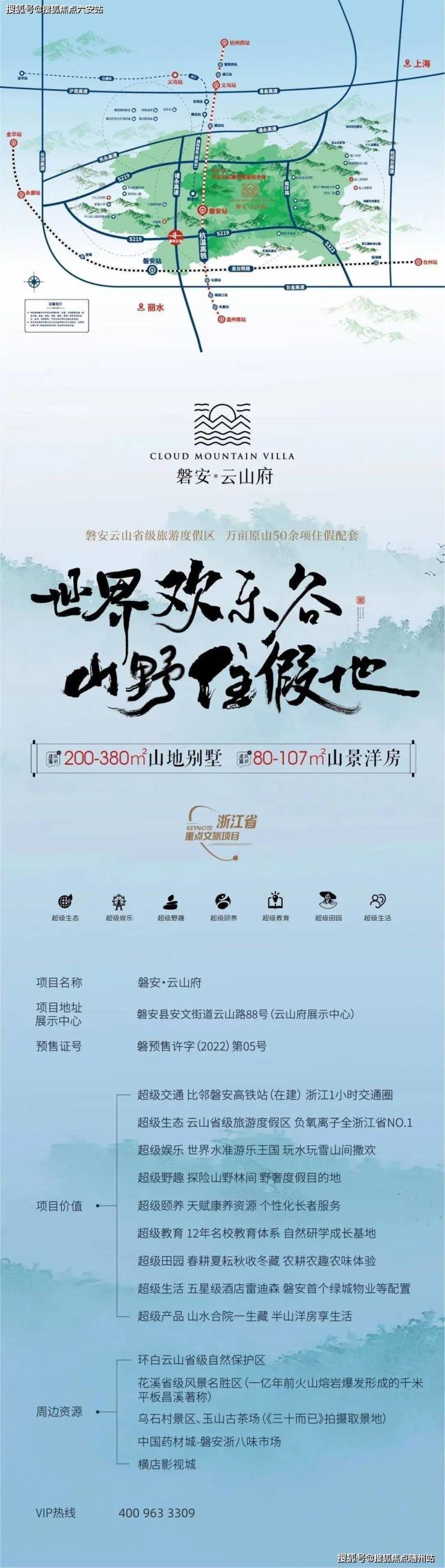 关键词索引:金华磐安云山府|一院一汤一世界|中式合院现房|实景现房|温泉入户|得房率220%|有天有地有院子|云山省级旅游度假区|杭温高铁|诸永高速|世界欢乐谷|浙江之心摩天轮|蒸汽小火车|绿城物业|200-380㎡合院|80-107㎡洋房|五证齐全|13000-15000元/㎡|8000元/㎡|南园学区|国医药膳馆|雷迪森酒店