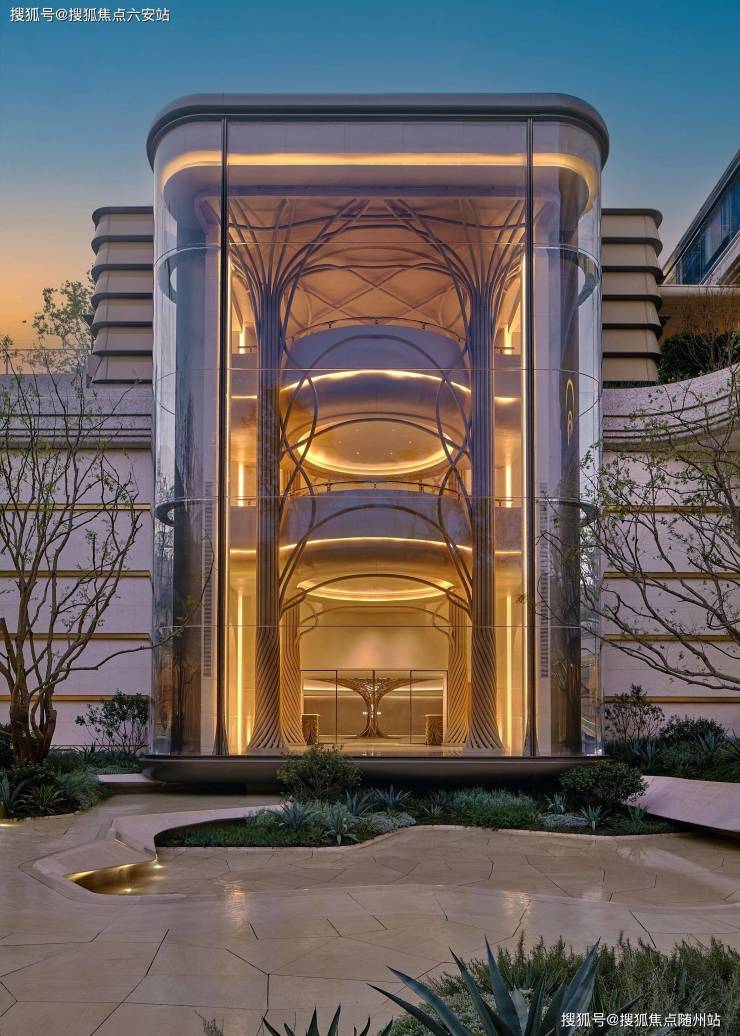 景观中庭的设计是市面上极为少见的三层观景式设计,以北宋画家范宽的《溪山行旅图》为范本,叠石、壑松及高低落差约15米飞瀑,亭台楼阁、檐下的游廊、小桥流水相互映衬,宛如一幅山水画卷。