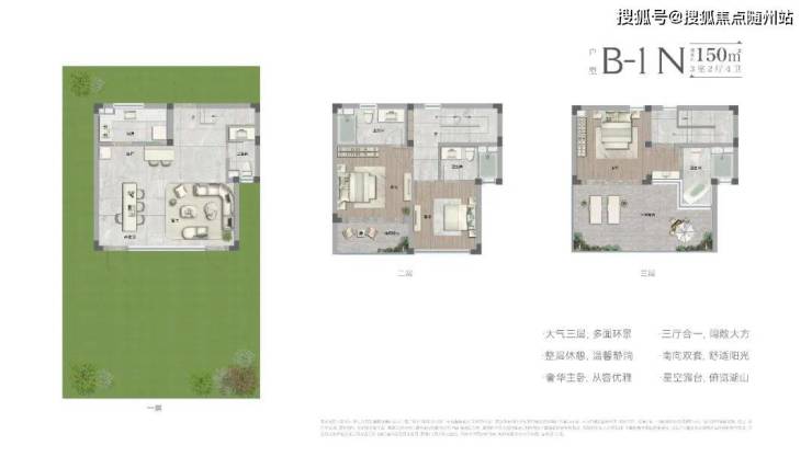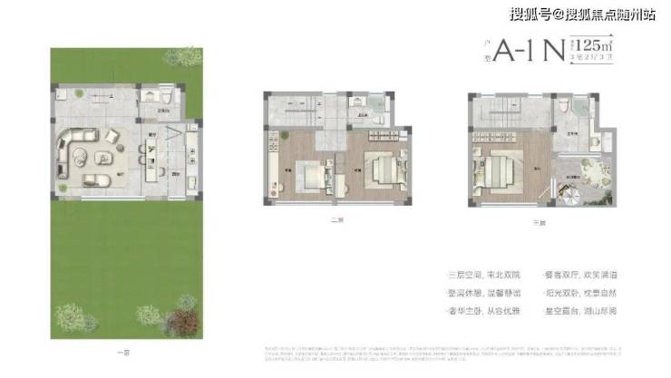 现代合院基本是地上三层为主、地上两层带阳光下挂层为辅, 约125㎡三房两卫, 一层为南向餐客厅+大花园,面宽约有7.5米;二层为两个朝南的卧室;三层是套房式主卧 。