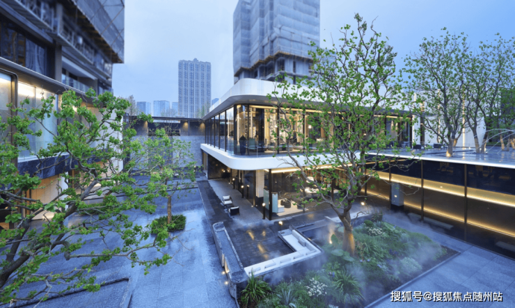 为增加园区入口的仪式感与尊贵感,西入口以三亚柏悦的镜面水景为灵感造景,层层叠水沿着景墙层层而下,水流撞击石材的声响,恰能隔绝外界的喧嚣。亨利・摩尔的不锈钢雕塑《宇宙与生命的骨形》静立其后,抽象线条与流水、树影缠绵,仿佛在说:最好的艺术,本就该生长在自然里。