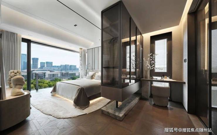 约40㎡行政级主卧既容纳所有又令生活归于平静。不仅配置步入式衣帽间、梳妆台、独立卫浴,南北皆设计270°转角落地窗玻璃,采光毋庸置疑,风景更是盛呈于眼前。