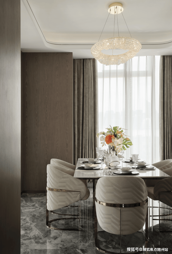 开放的客餐厅打破桎梏,餐桌选择了金属与石材结合的独特设计。在完美的采光环境下,让每一次品尝美食的过程也充满仪式感。水纹座椅呼应房间临江主题,让浮动的波纹化为稳固的装饰,承托住和家人一起分享的美好回忆。🔻售楼热线:☎ 400 832 8823「售楼处」☎〢网上售楼中心〢🔻