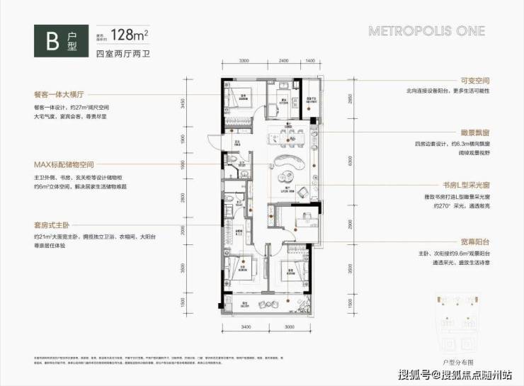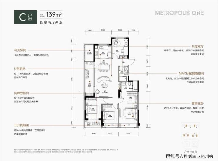 · 139㎡四房两厅两卫:大厅+双阳台+双飘窗,近29.7㎡开阔空间+9.4m南向三开间,套房式主卧带独立衣帽间,品质感升级;