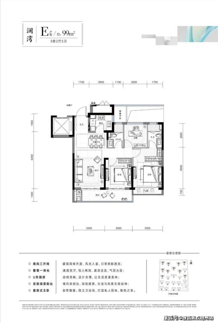◼建筑面积约99㎡户型,约9.8米三开间朝南、通透客餐厅、宽景双阳台、套房式主卧。