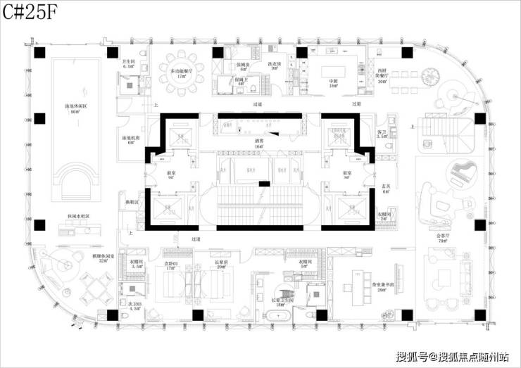 该户型由GFD广飞设计事务所创始人叶飞老师设计,共有五个套房+三个厅(两个小厅+一个餐客双厅)且带保姆房、司机休息室及300方私家屋顶花园。