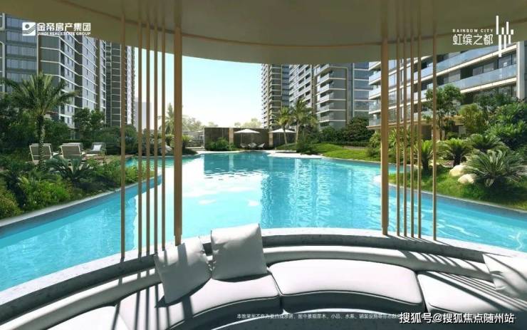 已经实景呈现的蒂芙尼蓝中心戏水池,水池边一道道弧形曲线,池底精致的马赛克拼花,透着满满的热带度假风,在配上水池旁挺拔的银海枣等热带植物,未来业主们往水池边一趟,仿佛就置身在东南亚的海滩边的高级度假酒店。