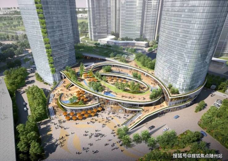 项目负二层直通地铁站(6、7号线—奥体中心站)。商场是地上3层,地下2层,中央是如同盘山公路般的螺旋绿丘,将奥体公园的绿色融于项目,打造垂直公园型商业。
