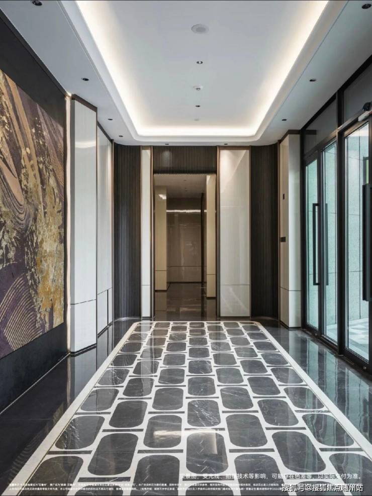 「摩登感」的美学,精装大堂,拼花地砖与华贵色调相得益彰,步履生辉,让归来也充满仪式感