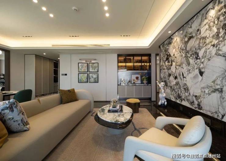 软装也贯彻了实用主义。入户的玄关柜、餐客厅的真大理石地面,客厅与主卧的背景墙等一应“打包”在了交付标准中。