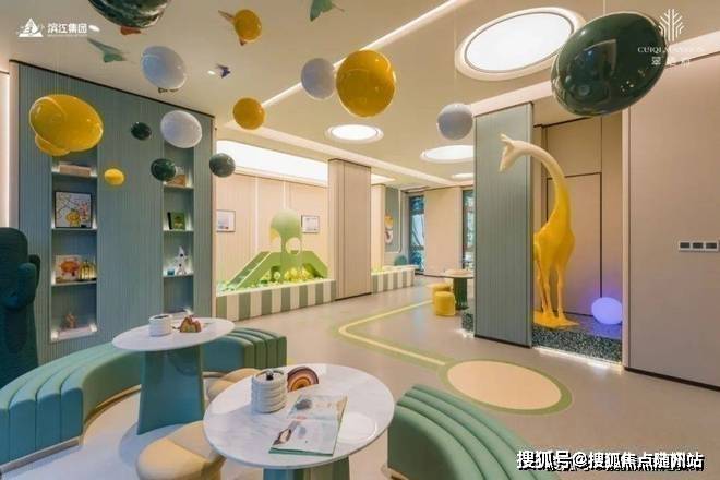 实景楼栋展示区,入户依然是精致的动线,中间一楼架空层是儿童嬉戏区,有奶绿色的如同油牛果千层的椅子、可爱的攀爬梯,还有一只黄色长颈鹿顽皮地探着头。