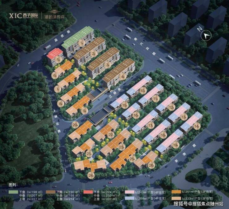 基于约1.1容积率的低密基因,遵循“南低北高、西低东高”建筑规划,创造性地采用“以湖为心、扇形铺展”的排布形式,规划3层合院、4层排屋、6层叠墅,并以“L型半围合”排布,将5幢6层叠墅沿城市道路布局,湖景资源最大化,打造「临湖而居,景城共生」的高端居住范式。