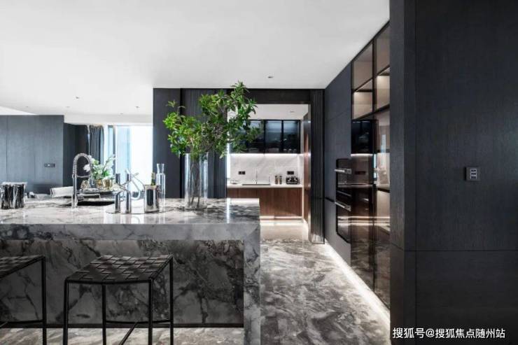 德国柏丽nobilia整体厨房,烤漆门板的选型为杭州壹号院量身定制,仿岩板色与深色木纹的搭配相得益彰,并加上柏丽的深色玻璃吊柜。定制设计中西双厨或开放式的社交厨房。巧思的细节设计,不论家庭互动还是会客聚友,都可以增加互动,社交无阻。