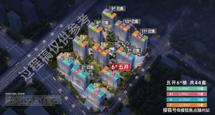 「棠悦芳华轩」五开-6#面积:99㎡22套、120㎡11套、139㎡11套,共计44套。