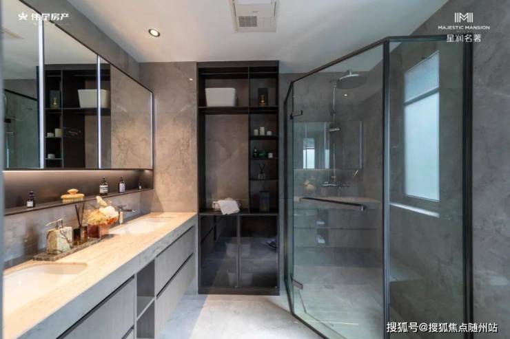 主卧宽约4米,带步入式衣帽间、独卫,而且卫生间还做了双台盆;次卧宽约3.5米,带独卫,居然也打了一整排衣柜!