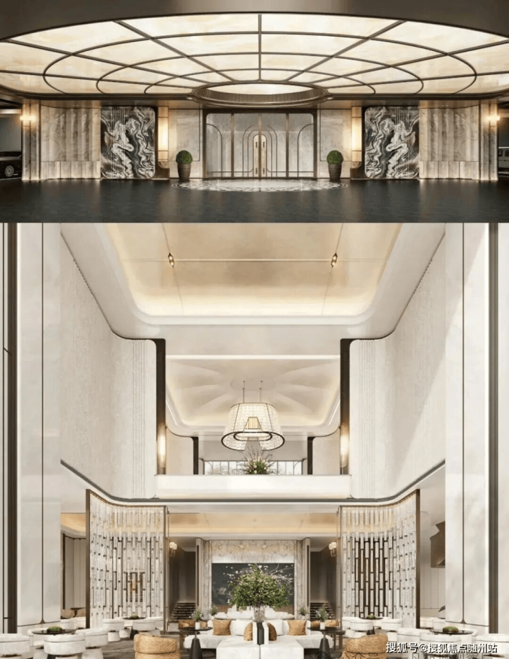 小区打造了经典高奢酒店式大门,挑高的大门廊、入口门厅宽敞明亮,采用高档石材、金属和玻璃材质,营造出强烈的归家尊崇感和仪式感。
