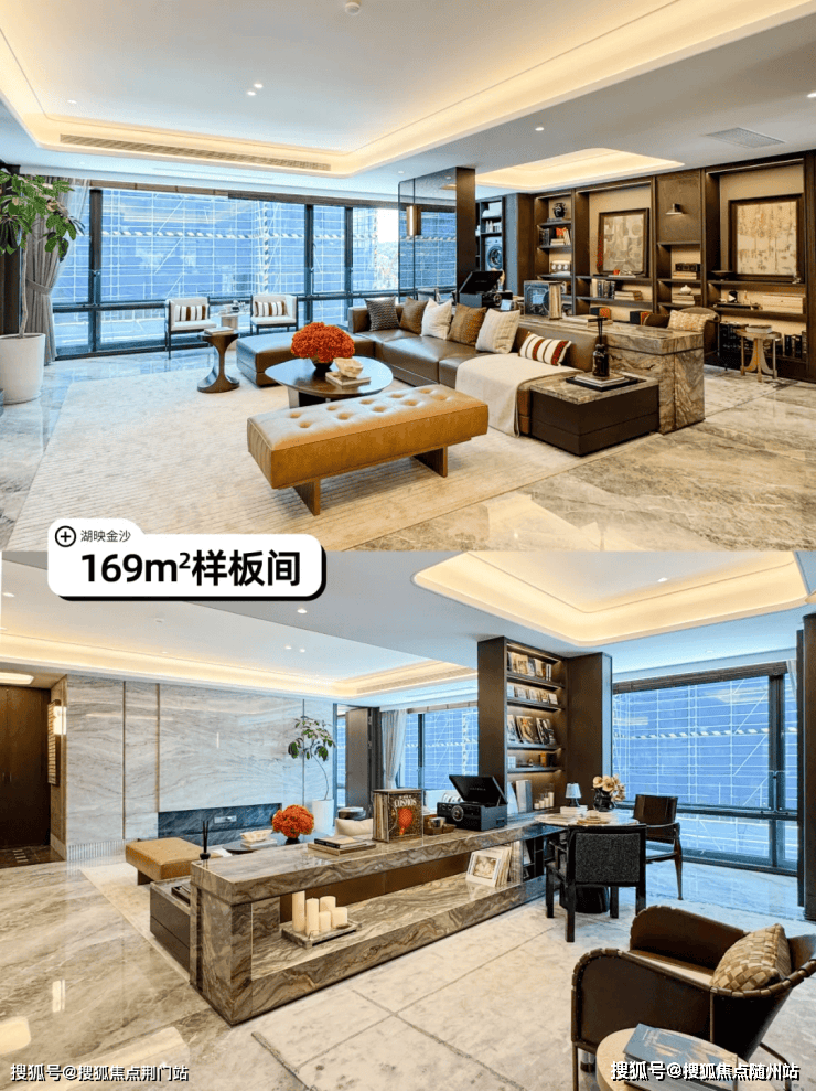 下沉庭院以约6.15米高的悬挑水帘、水中下沉卡座,构筑行走于水上的通行体验,与地下配套用房对话。地上地下的双园驱动,以直径约2.5米的雅典黑金花水钵为起点,以直径约2米的黄金麻整石水钵为终点,通过金澜线条的延续,串联景观故事线,回应湖映金沙的营销价值。