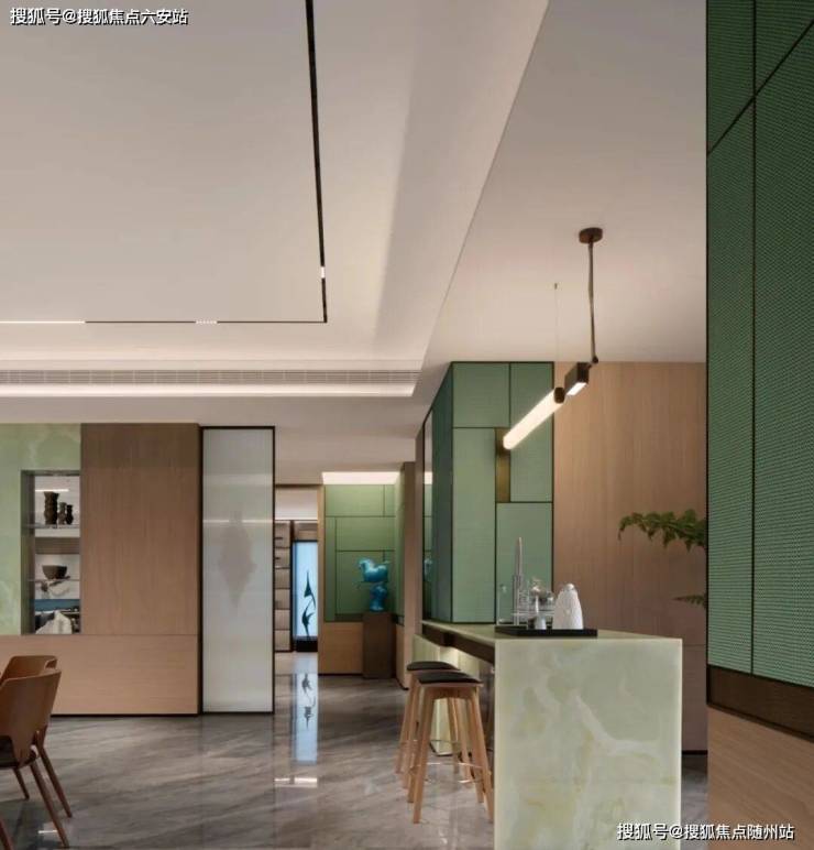 从《西湖清趣图》中选取了11种色彩,让整个空间弥漫着雅致的宋韵。餐厅的背景墙用的是皮革编织,他选了一款非常特别的色彩——中国传统的「梧枝绿」。嵌入手工锻造的金属后,墙面仿佛成了蒙德里安的一幅画作。