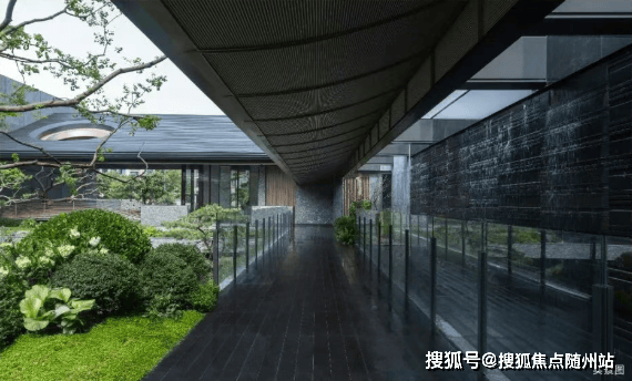 门庭之后,踏水归廊。以宋代「曲水流觞」的雅集中汲取灵感打造的「入园过渡空间」,归廊两侧是浅滩水景以手工雕刻的「安哥拉黑光面水切景石」形成「如波浪般的弧形纹理」,当水流经「潺潺轻响」行走其间,仿佛置身于「万家明月悬 秋浦,千尺飞虹锁暮流」的诗意场景。