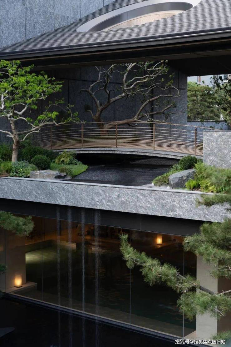 每一处都是宋韵风雅的穿越。比如“踏水归廊”,从宋代“曲水流觞” 的雅集中汲取灵感。比如约40米“和风游廊”,宋代标志性“黛色青瓦”定制了独特的美学标记,还有总高度达到了约10米的瀑布景墙!颇有大宋诗人祖无择笔下“绝巘千寻势,飞泉万叠痕”的气势......