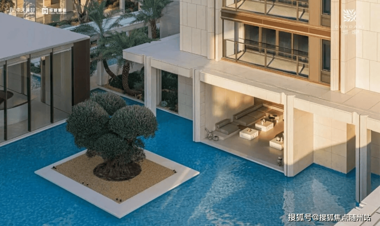 作为首个度假风情的住区,璟逸汲取希腊安缦酒店与Gundari度假村的精髓。素雅的米白石壁墙引领访客,穿行于水院与连廊之间,步入白色莱姆石建筑群,冰蓝水面与沙生植物交织的闲适景致,仿佛将圣托里尼的暖阳拥入怀中。入口处显眼的“矮大紧”树种,介绍说是有上千年树龄的油橄榄,这类树种单棵价格起码有250万,相当的豪气。
