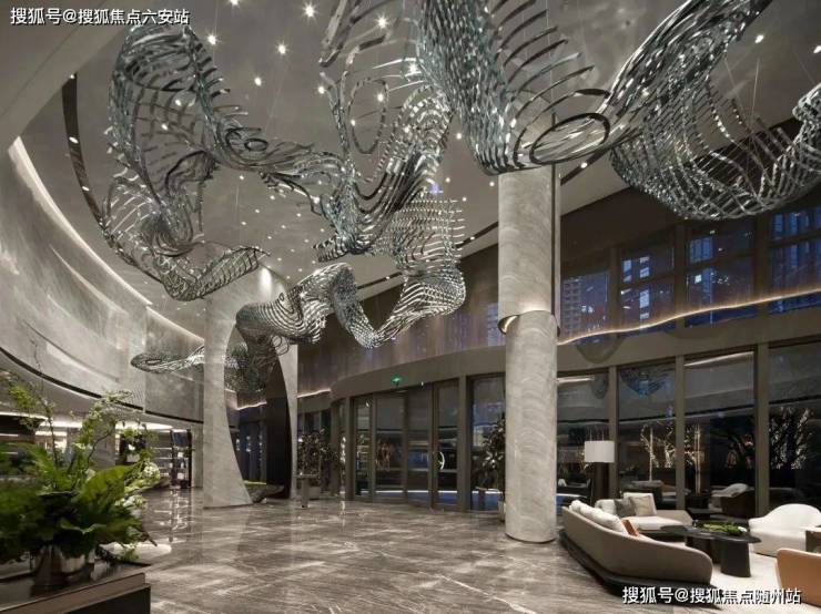 沿袭三叶草建筑的流线感,华鸿都会中心营造游艇式空间主题,黑白灰大理石的底色,局部以棕色和金属铜色擦亮,与上空悬浮的“潮汐”装置和船形雕塑相呼应,精琢堪比五星级酒店的精装入户大堂,提供了精神需求的秩序享受。