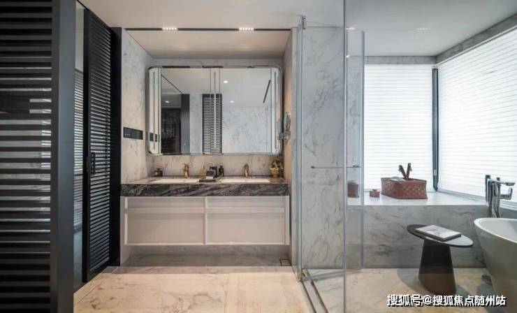 如三大件用的是华宅必备的全屋智能家居,日立两联供的中央空调、地暖,法国爱迪士的新风;厨房用的是博世四件套(燃气灶、吸油烟机、洗碗机、蒸烤一体机),2个东芝嵌入式冰箱,并额外配置3个拉篮;主卧还有日本皇家特供的伊奈智能马桶,沄璟主卫做了杜拉维特双台盆,再铺上威尼斯棕的台面,干净整洁的同时,也有美学视觉体验。