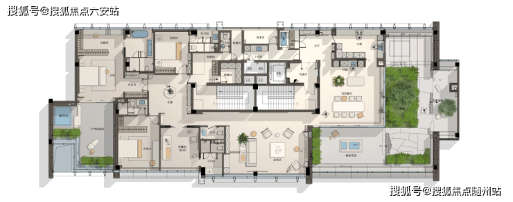 室内共4个户型各有特色,顶楼建筑面积约333㎡和建筑面积约357㎡的户型,约42m的面宽,相当于2/3个足球场的宽度,餐厅上方有天光倾泻而下,约250㎡的露台,像苏州园林般布局,主卧外还有个星空SPA池,躺在温暖的水流中,望着西湖群山听巴赫的《平均律》。