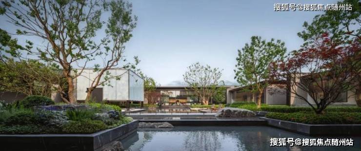 山水隐园设计灵感来源于“元四家”倪瓒的《江亭山色图》,设计师以石为纸、以水为墨,把 “淡烟流水画屏幽”之境融入场景,将坡岸、古树、空亭、静水以现代简约的方式呈现出来。