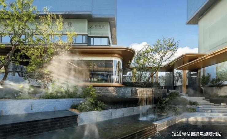穿过铜门,进入大堂,视线立即穿过通透的落地玻璃,一幅立体山水画卷呈现眼前,层层叠水,水波款款而下,枝繁叶茂,树影婆娑。