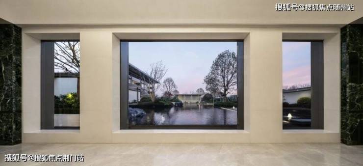 正中一面约3.6×4.8米的巨型玻璃,贝金米黄石材和仿古铜斜切出“画框”。