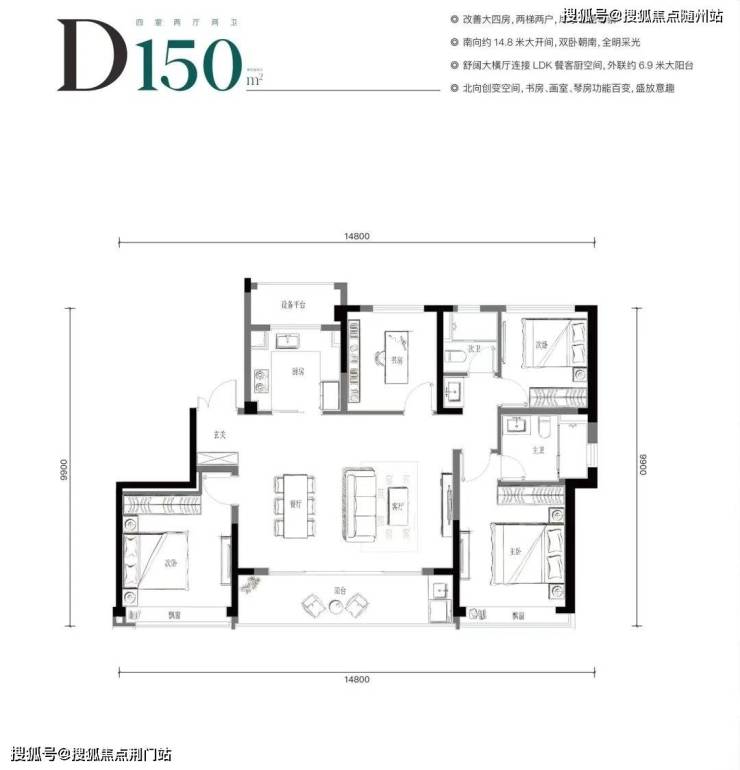 预算充足的,直接一步到位考虑最大的约150㎡大四房两卫,全两梯两户,南向面宽约14.8米、带约6.9米的大横厅。总价仅400多万,就能获得钱二那些千万大宅的“同款体验”。