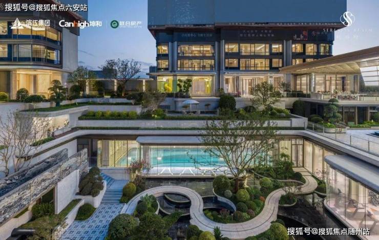 下沉式CLUB是一大亮点:一个“浮岛”般的玻璃BOX轻盈置于景观之中,内含恒温泳池、健身房、网球室、party房等多功能社交空间,结合跌瀑水景,打造出静谧与动态交融的度假式体验。