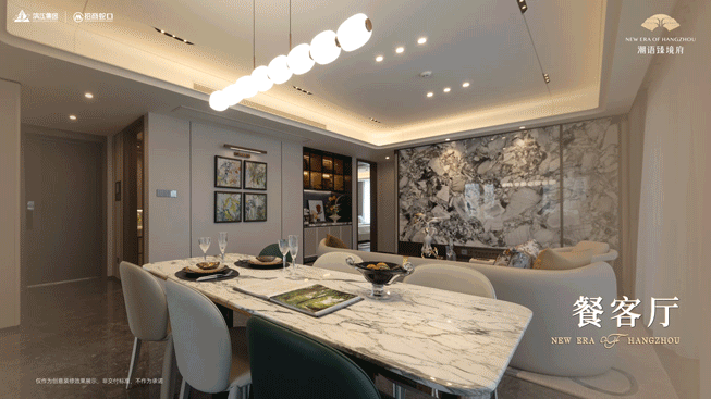 冷翡翠岩板背景墙带着冷调的坚硬质感与玉石光泽,而竖向圆弧皮革造型以柔软肌理与之对话,刚柔并济间,仿佛触摸到生活的多面性;温德姆灰大理石铺就地面,纹理自然柔和,质地坚硬细腻,承载日常的烟火欢聚。