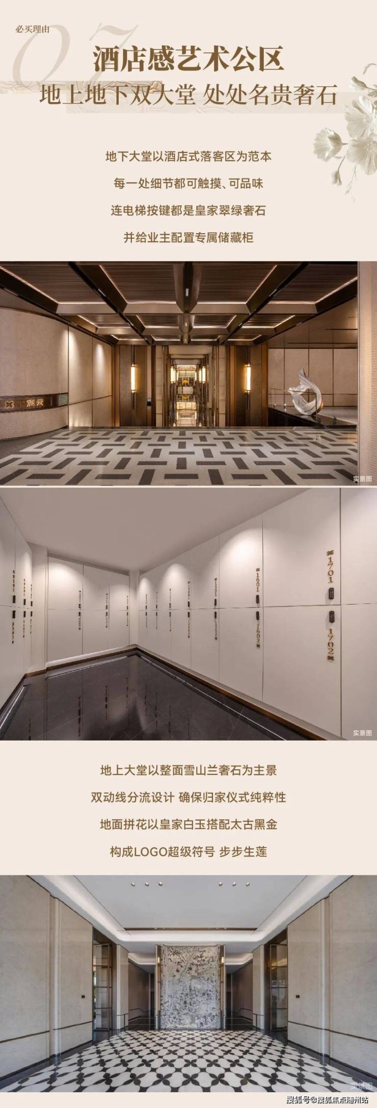 项目在细节处彰显品质,单元门厅地面采用石材拼花工艺,玄关墙定制白玉太古黑金拼花。主背景墙选用雪山兰奢石,纹如凝山,静显稀贵。地下光厅则采用海派轻奢风格打造,金属背景墙、岩板墙面、水磨石地面及铝板+发光云石吊顶,营造出酒店式归家感。