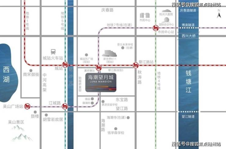 海潮望月城坐落于杭州望江新城板块,左邻西湖(直线约2.5公里),右靠钱塘江,是南星桥片区的“传承之作”。这里既有西湖的诗意(1.5公里内覆盖鼓楼、河坊街、南宋御街等历史地标),又有钱江新城的繁华(2.5公里直达来福士、万象城),更与K11购物艺术中心(规划中)、瑰丽酒店(在建)等顶级配套相邻,天然聚合“历史底蕴+现代繁华”的双重基因。