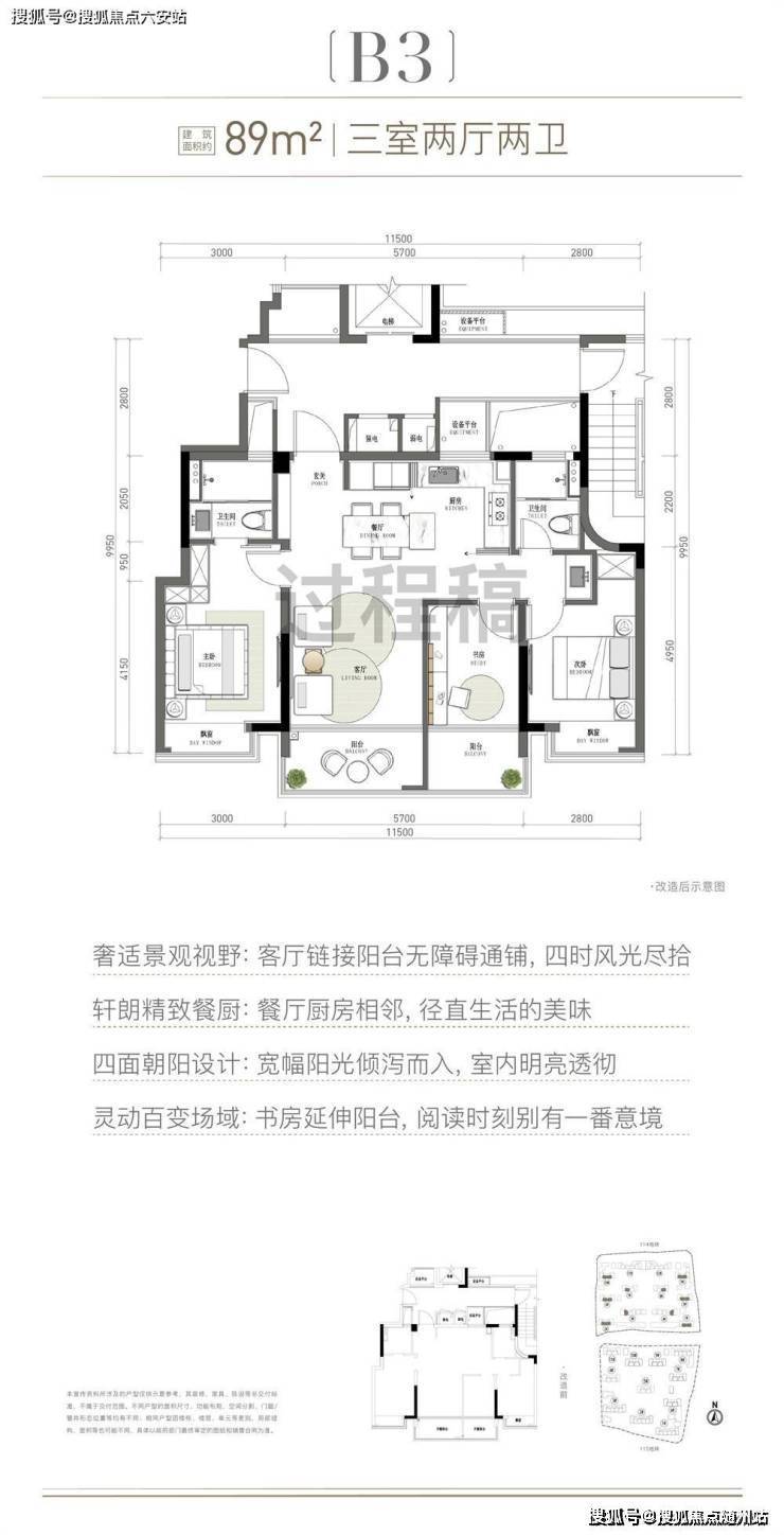 空间格局:四开间朝南,面宽约11.5米,媲美120方户型采光面;