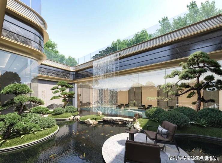 值得一提的是,项目打造了杭州市场上比较罕见的上下双瀑布,通过控制单层高度并加入钢丝网设计,柔化了水流冲击,最大限度避免了落差过大带来的噪音问题,让诗意与静谧完美相融。