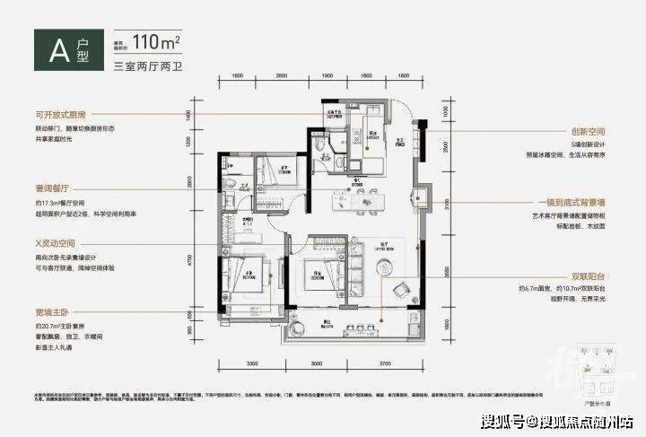 约110平方米的户型通过动静分区的设计理念确保了生活的有序,三个朝南的开间和阳台设计保证了优越的采光,每缕阳光都能照亮家中每个角落。同时,两个卫生间的设置有效解决了家庭成员早间排队的问题。