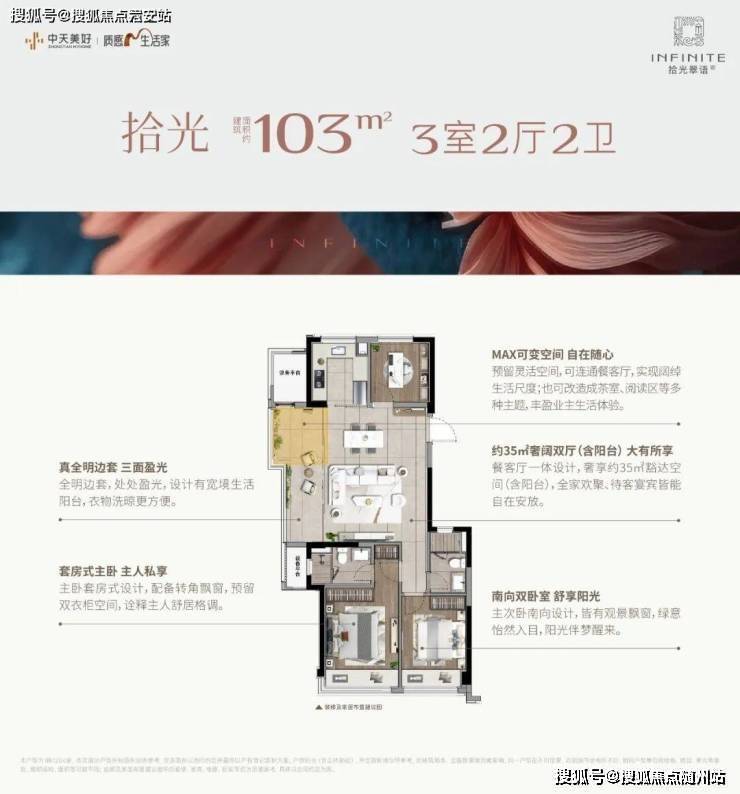 建面约103㎡的边套更是堪称神迹,将小户型的空间魔法玩到了极致。客厅到阳台的地面、天花直接拉通,甚至两侧的墙垛都已隐身,整个餐客厅面积达到约35㎡(含阳台),这可是140㎡以上大宅才有的空间感!
