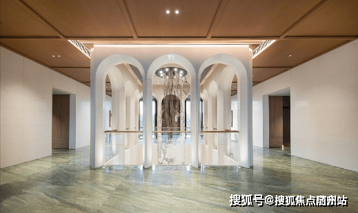 公区方案由于舍操刀,社区大堂内中庭超7米挑空打通双层视野,12座拱形廊柱阵列环抱水晶雕塑,构成一座雅奢美学殿堂。