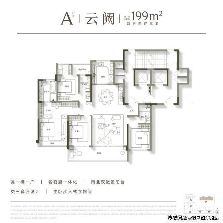 首先从空间上,199㎡做成类一梯一户,四房两厅三卫(三套房设计),南向面宽约16米,南向约8.5米景观大阳台,户户赠送储藏柜,兼顾了三代同堂的大家族生活。