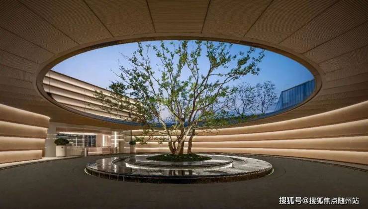 穿过沧浪华盖之后的第二重门厅“天光云廊”,环形的回廊中间,超过百年树龄、高约10米的乌桕,中心设计双悬浮水景装置,蓝翡翠石材与安哥拉黑石材搭配,圆形水盘通过循环水流,形成动态水幕,灵感来源于迪拜棕榈岛喷泉的悬浮效果。